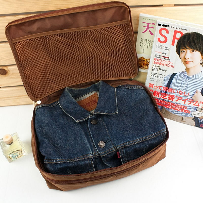 The bag is able to expand and compress the capacity. It can expand the height from 12 cm to 21 cm. Oppositely, it also can compress and save 50% space without adding extra weight.