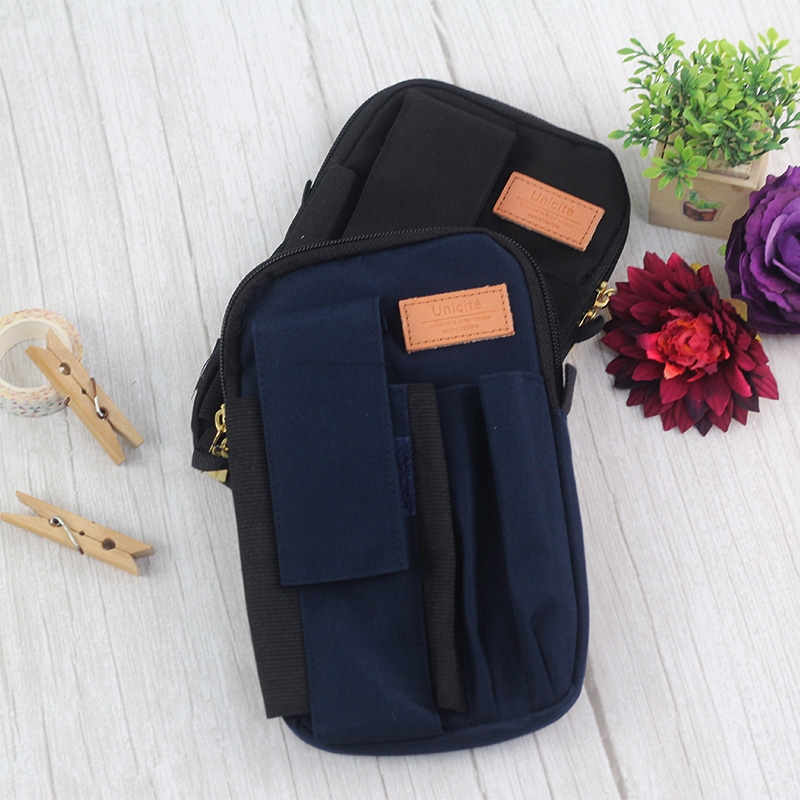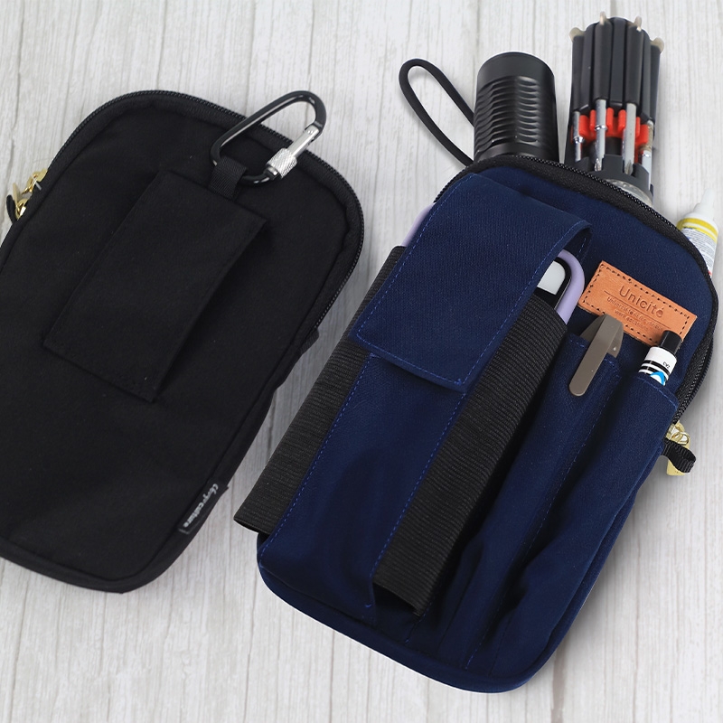 The frontside with 3 pockets. 2 pockets are for pens, rulers and utility knifes. 1 pocket with Velcro is for your phone.