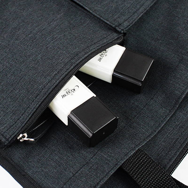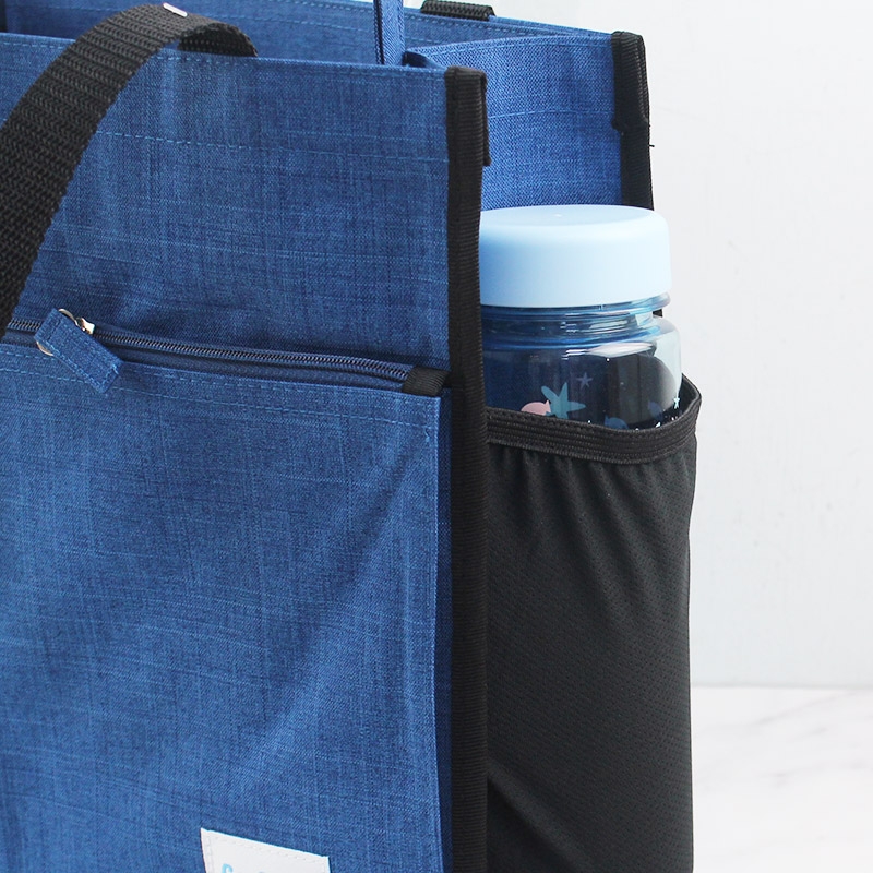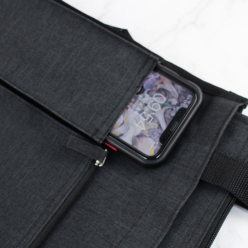 Large capacity and multiple compartment. The bag contains two front pockets which one with a Velcro and another is designed a zipper pocket. The bag also has two lateral pockets with stretch fabric for water bottles or umbrellas.
