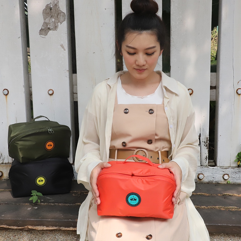 Large capacity and multiple compartment. The bag contains 6 interior pockets and a middle interior pocket. It can store 6 bras and 6 panties. The middle interior pocket can put towels or maxi pads.