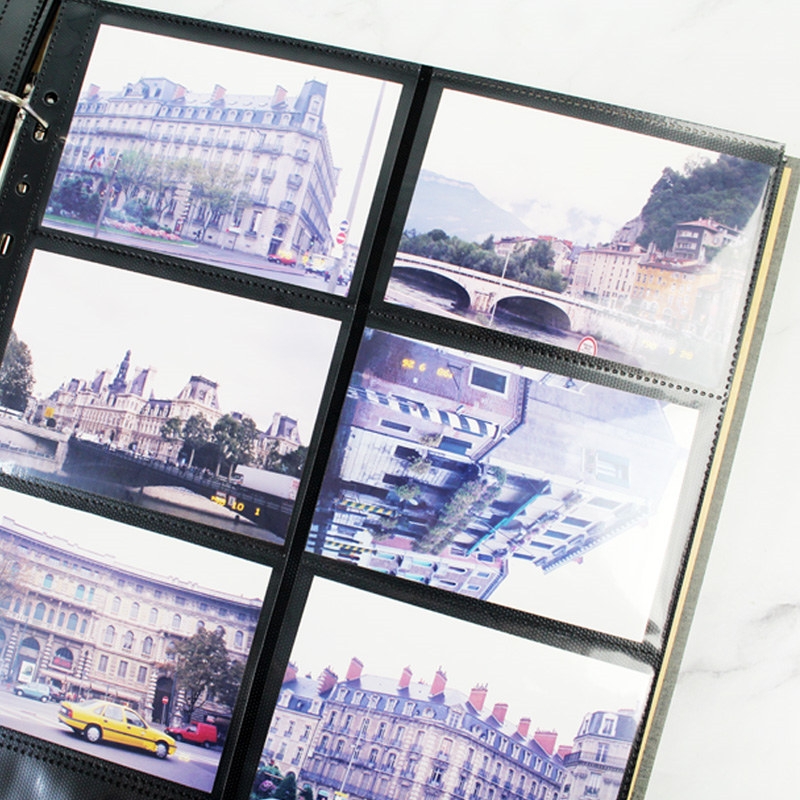 - 6 pockets per page. Each pocket is sized 13.4 x 9.3 cm.