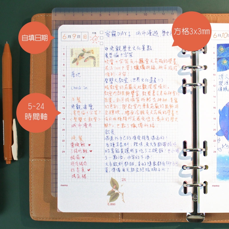 Undated daily planner allows you to arrange and record your schedule more flexibly and efficiently. 1-page-per-day with timeline format makes you easily view the schedule from 6 am to midnight.