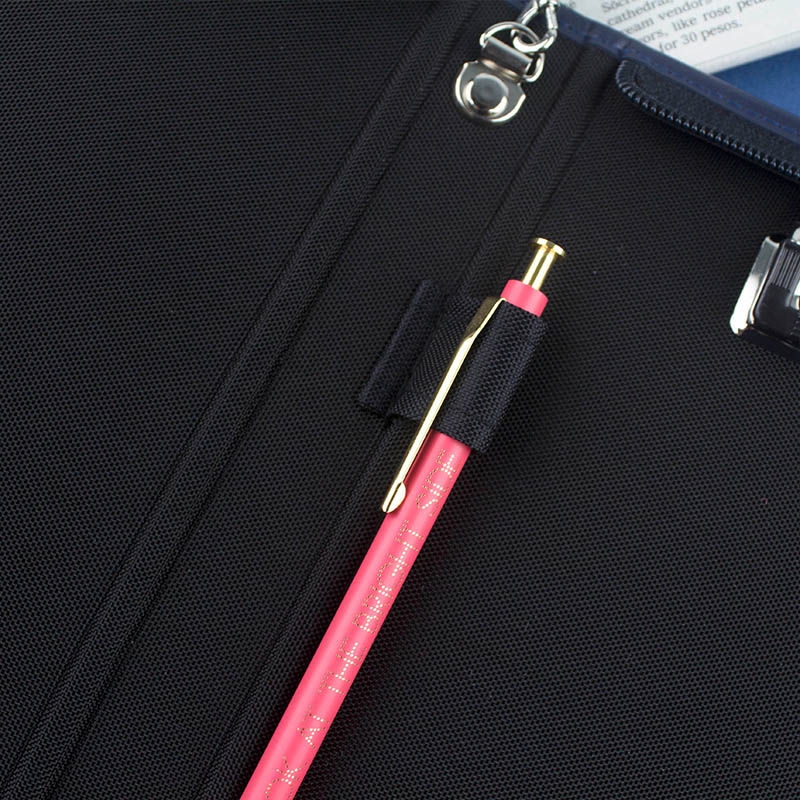 The multifunctional portfolio has 3 slots for storing business cards, a ID card holder with a clear window, a pen holder, a large interior pocket, a clipboard for writing and a hanging strap for portability.