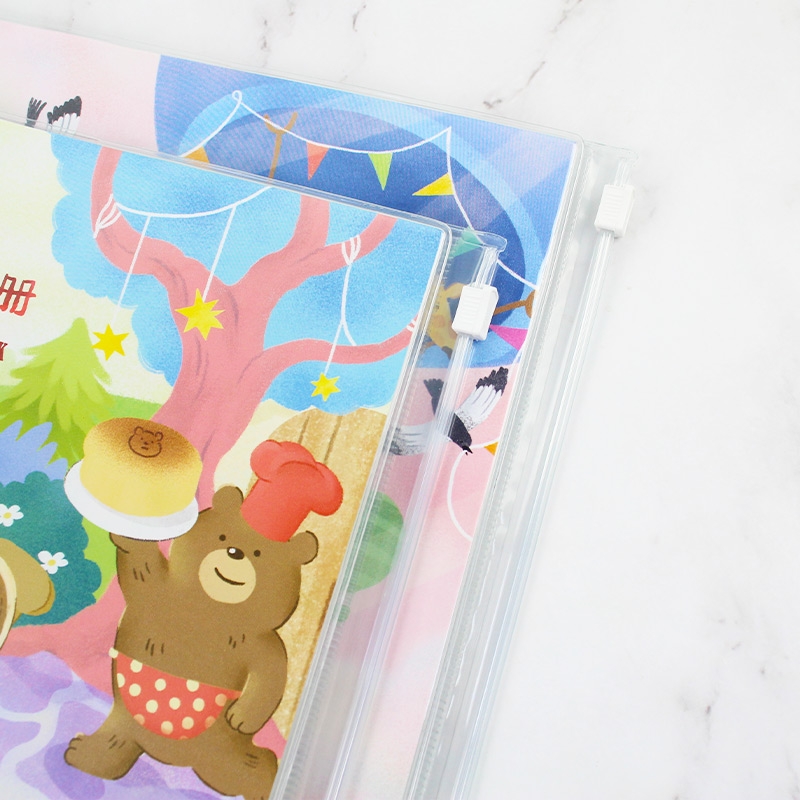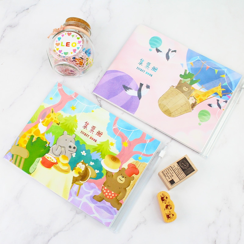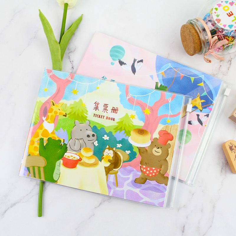 Attaches a clear and waterproof book cover with zipper bag for storing tickets, stickers, receipts, etc.