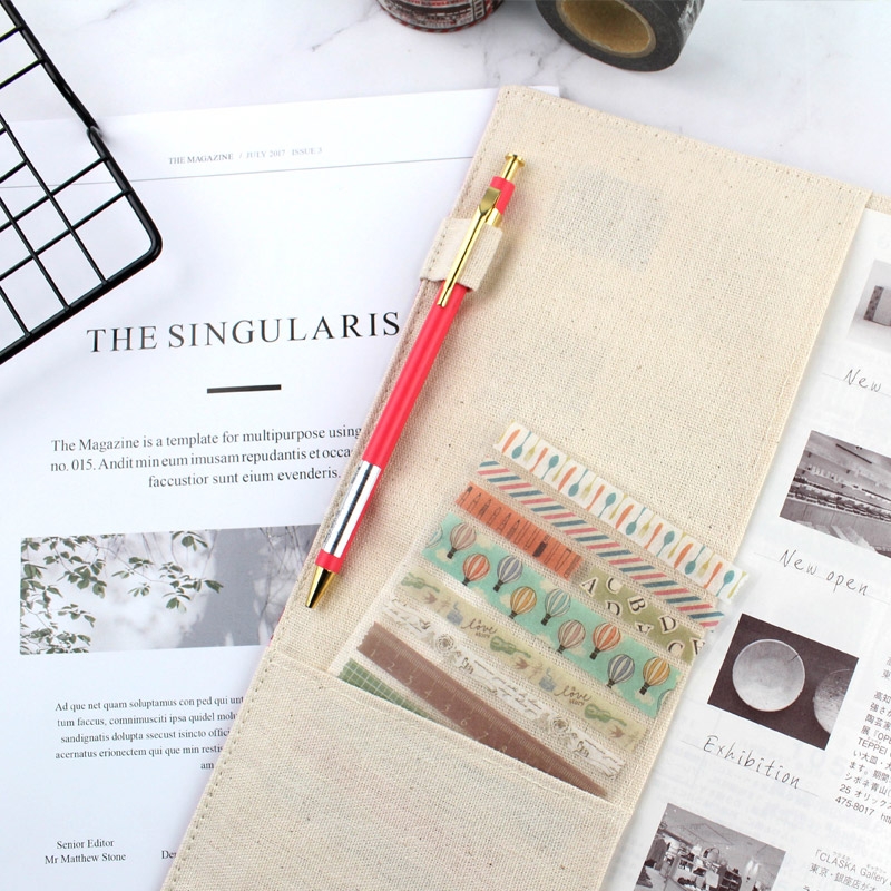 The book sleeve contains a pen holder, a inner pocket and a bookmark strap.