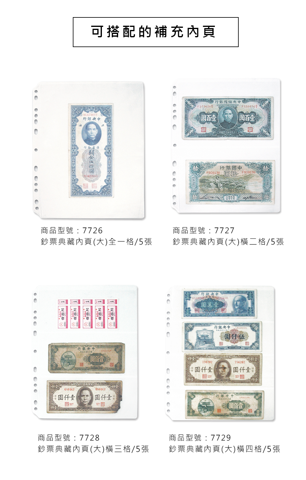 - The ring binder is applicable to our money refills:7726, 7727, 7728 and 7729. There are 4 different formats you can choose from one pocket to 4 pockets per page.