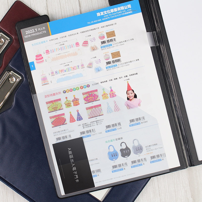 內有斜口袋,可放各式資料、目錄;開孔可放票卡、名片