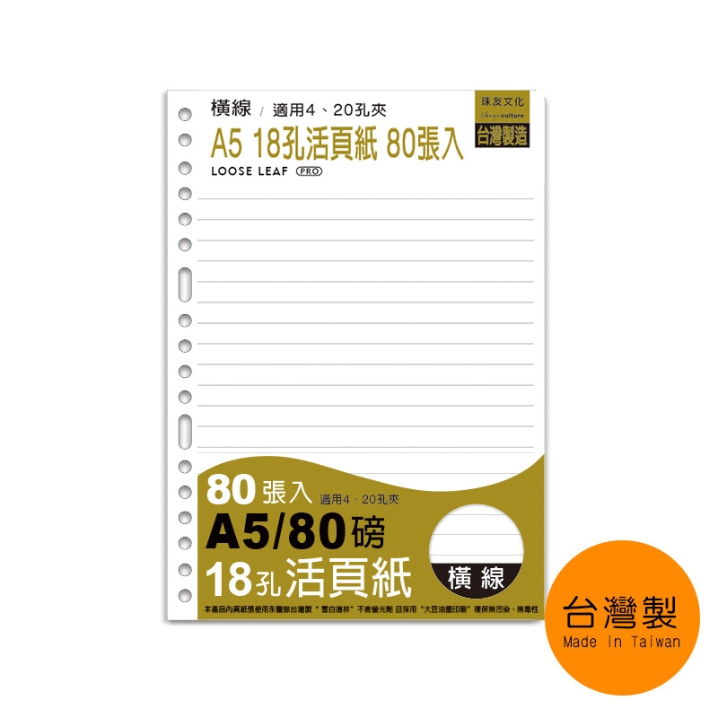A5/25K 18孔活頁紙/橫線活頁紙/A5活頁紙/活頁筆記本補充內頁(80磅)80張(適用4.20孔夾)