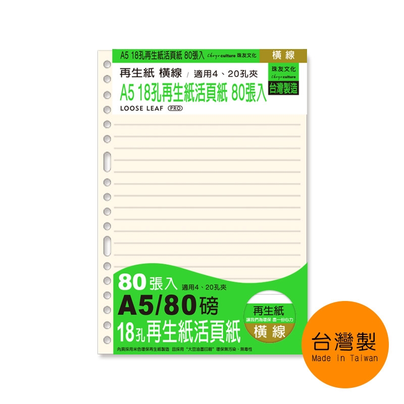A5/25K 18孔再生紙活頁紙/橫線活頁紙/A5活頁紙/活頁筆記本補充內頁/萬用手冊內頁/手帳內頁(80磅)80張(適用4.20孔夾)/1本入