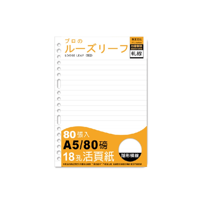 A5/25K 18孔活頁紙/軋線活頁紙/A5活頁紙/活頁筆記本補充內頁(80磅)80張(適用4.20孔夾)/隱形橫線