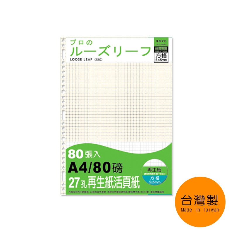 A4/13K 27孔活頁紙/再生紙活頁紙/5X5方格/A4活頁紙/活頁筆記本補充內頁/記事本補充內頁(80磅)80張(適用2孔夾3孔夾4孔夾30孔夾)/6本入