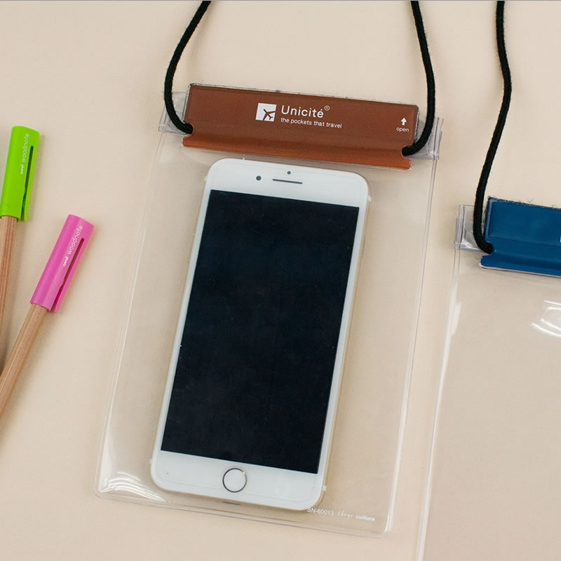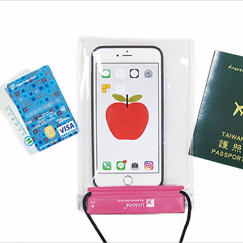 防水防塵密封設計,可保護護照、票卡…等物品 將魔鬼氈打開即可裝入手機 再依折痕對折黏緊即可