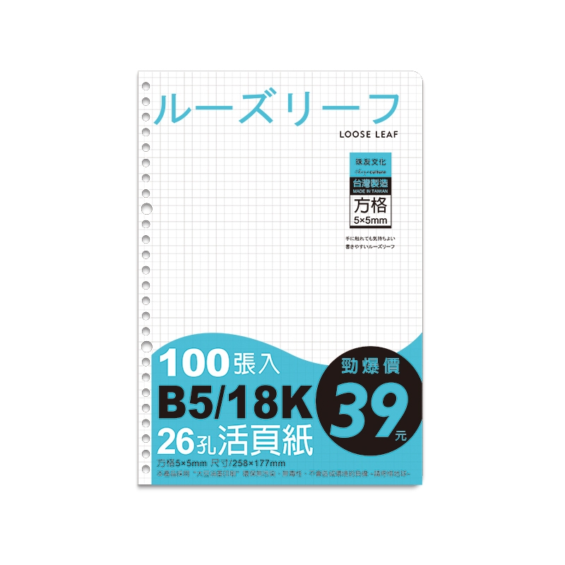 B5/18K 26孔活頁紙/方格活頁紙/B5活頁紙/活頁筆記本補充內頁(65磅)100張(適用26孔夾)