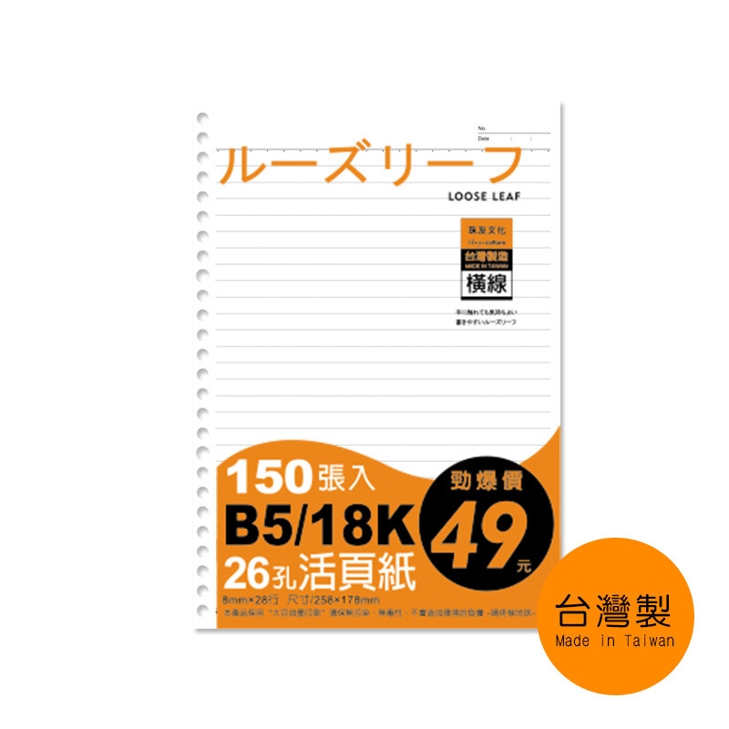 B5/18K 26孔活頁紙/橫線活頁紙/B5活頁紙/活頁筆記本補充內頁(65磅)150張(適用26孔夾)