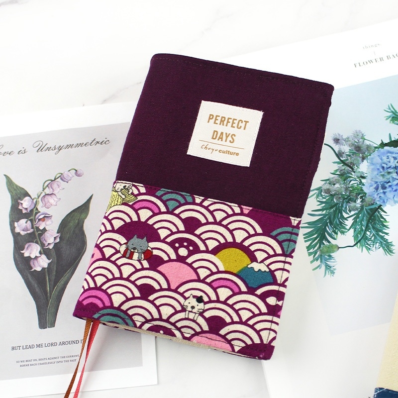 【網路限定】A6/50K 台灣花布拼色可調式棉麻布書衣/書皮/筆記手帳書套/書皮手帳書套/書本保護套/布質書衣/多功能書衣-01貓踏浪
