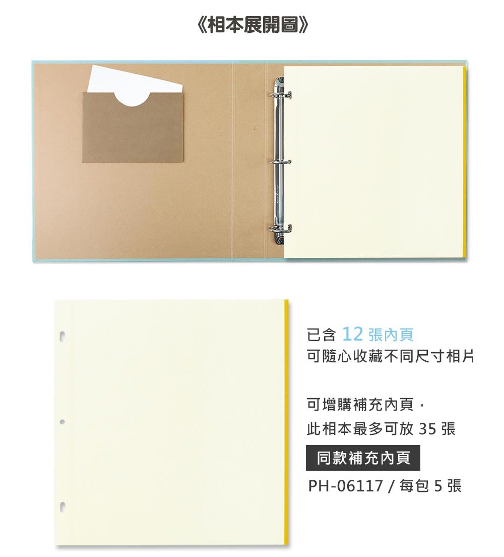 - 加大活頁夾,內頁可自行增減,最多可放35張自黏內頁